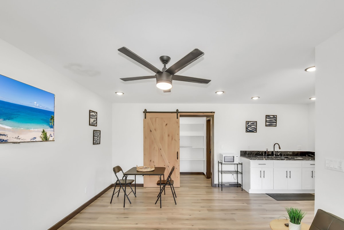 Escápate a la exuberante serenidad de la isla de Hawái con este acogedor estudio ubicado en Kea'au, a poca distancia en auto de las playas, tiendas y atracciones de Hilo. Perfecto para estancias prolongadas, trabajadores remotos o profesionales que viajan, este estudio privado ofrece un alquiler asequible a largo plazo rodeado de vegetación tropical. Nota: Otro inquilino de alquiler vacacional estará presente en la casa principal, que se encuentra en la misma propiedad. El estudio es completamente privado con su propia entrada, lo que garantiza una estadía tranquila e independiente. Este moderno estudio de 30 noches como mínimo cuenta con un cómodo diseño abierto con todo lo que necesitas para una estadía sencilla y tranquila. En el interior, encontrarás: Disposición para dormir: cama futón y un colchón de aire inflable adicional para opciones de sueño flexibles Cocina pequeña: equipada con una mininevera, una placa de cocción de dos quemadores, un microondas y utensilios de cocina para preparar comidas ligeras. Baño: baño completo con ducha y todas las comodidades básicas Características de confort: unidad de aire acondicionado portátil en la ventana, ventilador de techo y ventanas con mosquitero para dejar entrar la brisa de la isla Nota: No hay lavadora ni secadora en el sitio. Los huéspedes pueden acceder a varias lavanderías cercanas en un corto trayecto en auto. No se permiten reuniones grandes. Cámaras de seguridad exteriores en el sitio y estrictamente aplicadas. Los inquilinos del sitio que usan la casa principal pueden estar presentes. Ubicación Ubicada en el tranquilo distrito de Puna, esta casa ofrece una experiencia local tranquila mientras está cerca de: Hilo Town: a solo 20 minutos para cenar, ir de compras y visitar los mercados de agricultores Parque Nacional de los Volcanes de Hawái: a 40 minutos para caminatas inolvidables y paisajes de lava Kehena Black Sand Beach, Pohoiki Warm Ponds y otros tesoros costeros pintorescos Ya sea que busques un espacio tranquilo para trabajar de forma remota o una base para explorar el este de Hawái, este estudio de Kea'au ofrece comodidad, privacidad y una excelente relación calidad-precio para estancias más largas.