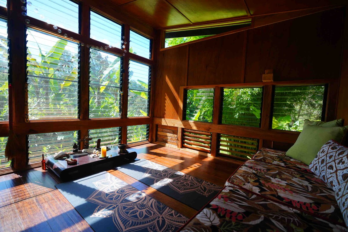 Nuestro pedazo de paraíso se encuentra en 1 acre de huerto tropical cuidado con más de 40 variedades de árboles frutales, un soporte gigante de bambú, cientos de orquídeas y hierbas. Casa de campo tipo estudio independiente de nueva construcción con cama tamaño queen con dosel y futón de tamaño completo supercómodo. Baño interior con ducha y ducha de bambú al aire libre. Cocina a estrenar y un adorable lanai para disfrutar de la vista panorámica del atardecer o del café por la mañana. Nuestro columpio de teca sobre la cabaña ofrece vistas al horizonte del océano.