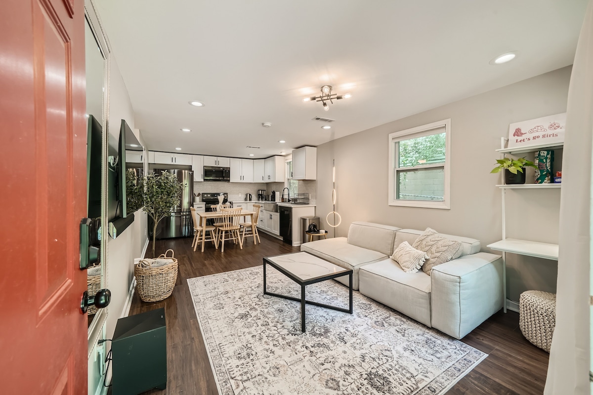¡A solo 11 millas de Broadway y a 10-15 minutos de Opry y East Nashville! Aléjate del bullicio de la ciudad en nuestro tranquilo vecindario sin comprometer la proximidad al centro de la ciudad. Este estudio en el sótano cuenta con cocina completa, bañera de hidromasaje, cama tamaño KING y patio con asientos al aire libre y fogata. Ten en cuenta que esta es la planta baja de nuestra casa y hay escaleras hasta una puerta cerrada con llave sobre la que hemos puesto una cortina. Tenemos un bebé y un perro arriba, ¡así que es posible un ruido menor en la parte superior!