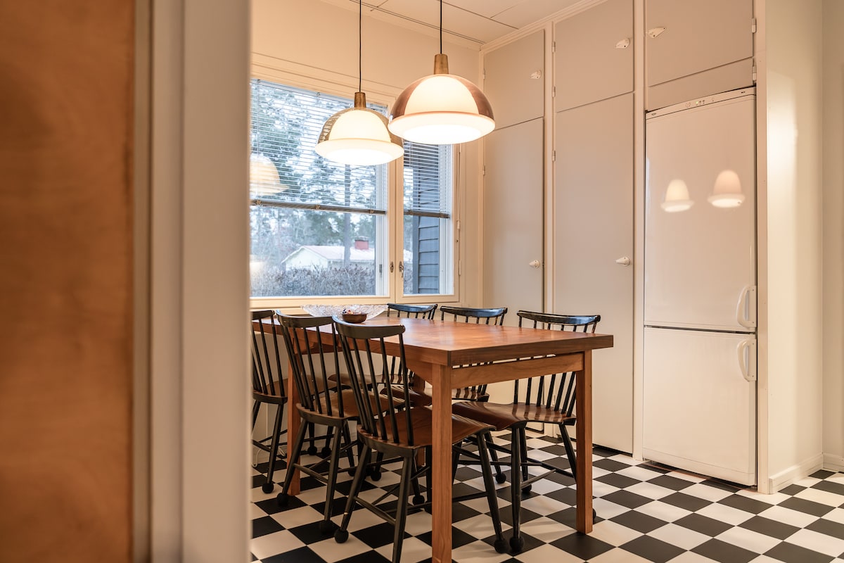 Un pequeño estudio práctico en nuestra casa unifamiliar con garaje. Entrada independiente. Inodoro, ducha, refrigerador de cocina, horno combinado/microondas, placa caliente. Loft para dormir de 180 cm de ancho. Sofá cama subterráneo de 80 cm o 160 cm extendidos. Bomba de calor de fuente de aire para refrigeración/calefacción. Por favor, trae tu propia ropa de cama y toallas. Hay mantas y almohadas. Si no tienes sábanas, puedes obtenerlas solicitando un préstamo. 5 €/persona. El estacionamiento está en nuestro patio, los autobuses locales cada 30 minutos.