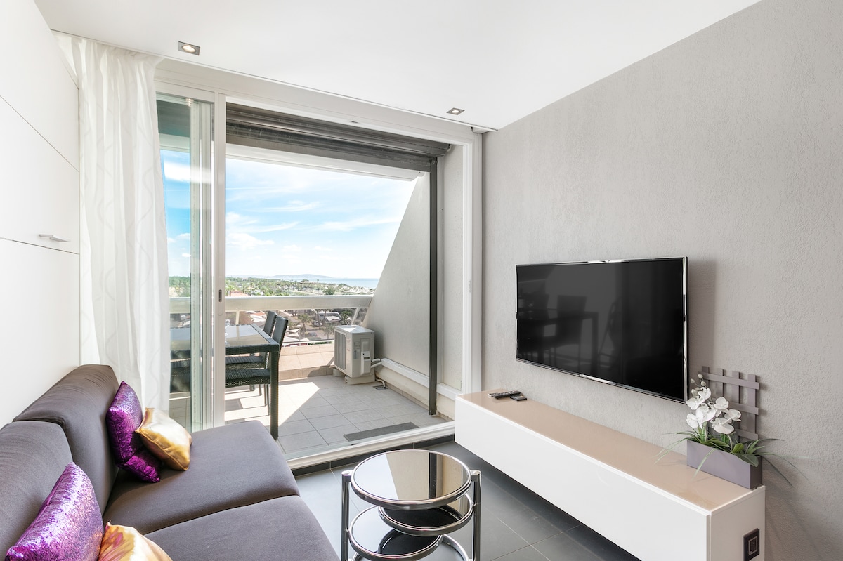 COMPLETE RENOVATION 23 Sea and beach amazing view ...From the wooden terrace, you can have breakfast at sunrise facing the sea, take a nap on the sofa or have an aperitif and enjoy the sun set. Located on the 3rd floor (with lift) of the Héliopolis residence, this studio is fully equipped (air conditioning, 160x200 bed, plenty of storage, bathroom, separate WC, kitchenette). Bed linen and towels are provided, as well as WiFi and a private parking place.