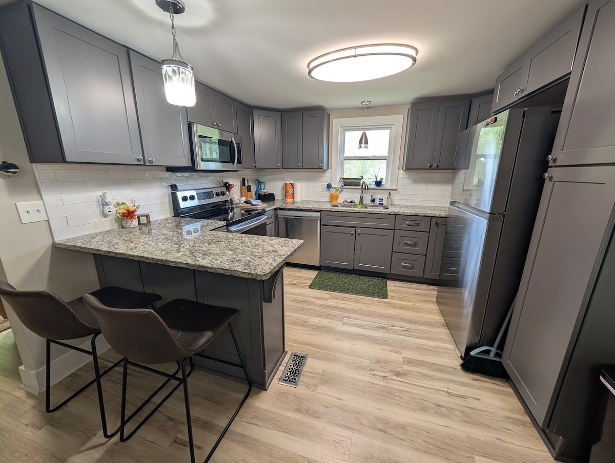 ¡Nuestra casa de campo es acogedora, privada y segura! Está totalmente equipada para que tu estancia sea lo más placentera y despreocupada posible. Tenemos wifi, 2 televisores con Roku, una radio Bose con CD, un reproductor de DVD con películas. Tenemos una estación de café con Keurig y cápsulas, un Mr Coffee con un molinillo de café. Cocina totalmente equipada. Combo bañera/ducha. Mucha privacidad en tu propia terraza trasera. Es posible que veas ciervos y pavos salvajes. Se proporciona parrilla de gas. Mucho aparcamiento. NO SE ADMITEN MASCOTAS.