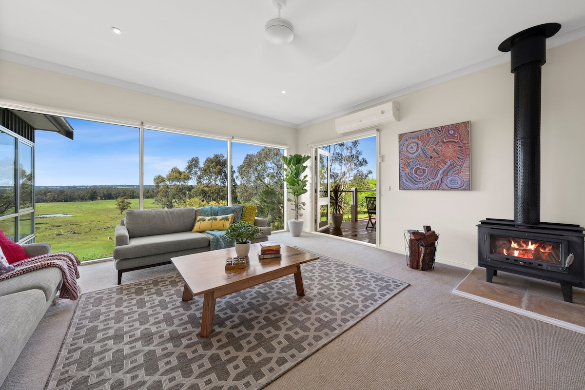 Disfruta de impresionantes vistas sobre nuestro bosque nativo, praderas y el monte Kooroocheang. Moorakyle Retreat se encuentra en 300 acres, privado, independiente con una cocina completa, rodeado de campo y jardines, y está separado de la casa principal. La casa es moderna, está bien equipada, llena de luz natural, con calefacción/refrigeración completa y una chimenea de leña. Imprescindible para los amantes de la naturaleza y los animales. Estamos a solo 15 minutos de Daylesford y a poca distancia de todo lo que las tierras altas centrales pueden ofrecer.