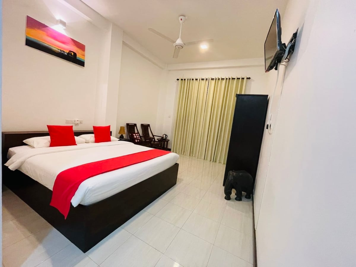 Este es un apartamento en el primer piso a la derecha, parte de un apartamento de dos dormitorios. La habitación cuenta con un baño adjunto con agua caliente y está equipada con aire acondicionado. Tendrás acceso a una cocina compartida y a una sala de estar, con todos los utensilios de cocina y una lavadora. En el exterior, puedes disfrutar de un hermoso jardín verde con piscina, donde puedes ver aves y monos. Es un lugar tranquilo y relajante, a solo 7 minutos a pie de la famosa playa de surf de Hikkaduwa.