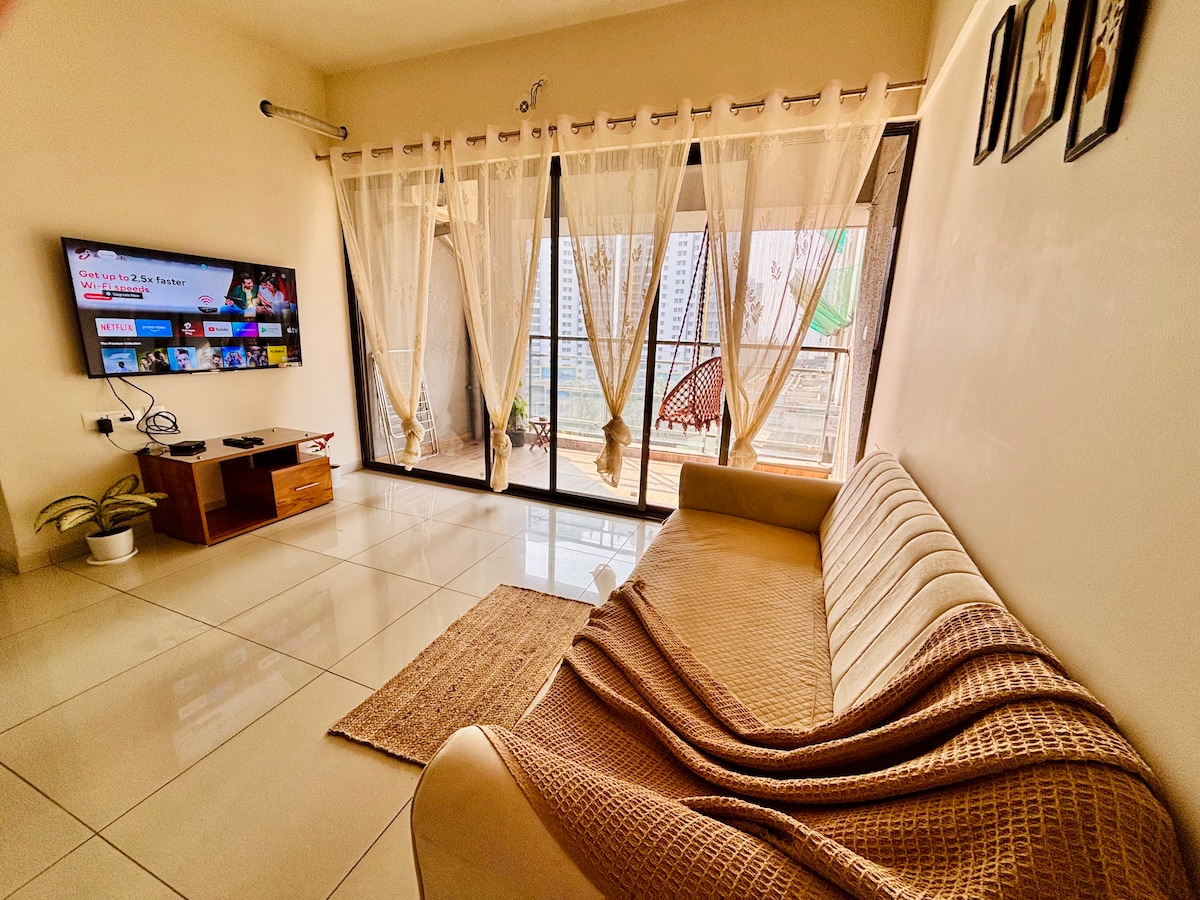 A Cozy, modern Flat in Blue Ridge Town, Hinjewadi with chic lighting, lush plants and a comfy sofa - all framed by calming city views with mountain ranges. Perfect for relaxing and unwinding.