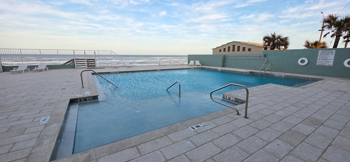 *** ¡La piscina nueva y el acceso a la playa están abiertos!*** ¡Bienvenido a Daytona Beach Bliss! Disfruta de nuestro estudio frente al mar recientemente remodelado a solo unos pasos de la playa. ¡El balcón privado del quinto piso tiene una hermosa vista directa al mar! ¡Coge el amanecer por la mañana e incluso es posible que veas algunos delfines! Ubicado en Daytona Beach Club, este acogedor estudio tiene capacidad para 4 personas con una cama tamaño king y un sofá cama. El espacio es el más adecuado para 2 adultos o una familia con 2 adultos y 1-2 niños.