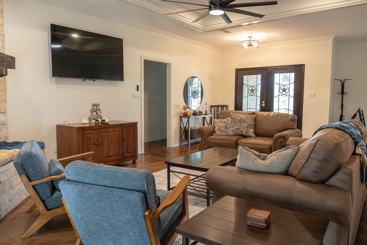 Diviértete con toda la familia en nuestra hermosa y moderna casa de campo junto al lago Texoma. A menos de 10 minutos en coche del lago, podrás disfrutar de actividades acuáticas y varias caminatas durante tu estancia. Nuestra casa de campo que admite mascotas ofrece espacio para tu amigo peludo en nuestro recinto para perros con sombra del pacano. Disfrutarás de nuestro rincón de juegos de arcade, asientos al aire libre y muy cerca del lago Texoma. Asegúrate de dar un paseo por el centro de la ciudad en Main St. para ir de compras y cenar.