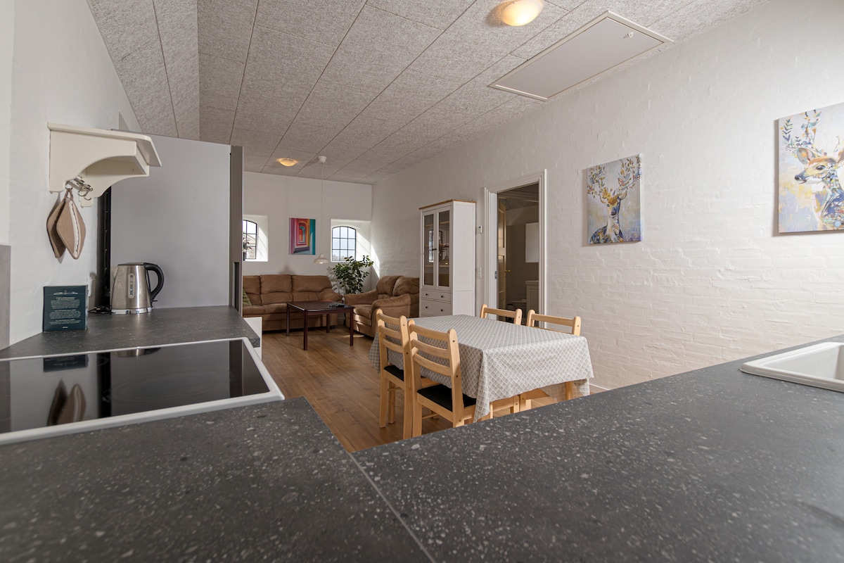 Ferielejlighed på 1. sal af vores nedlagte landejendom. Den er ca. 30m2. Her er dobbeltseng (160x200), lænestole, sofabord og TV. Spiseplads til 4 og et lille køkken med køl, frys, kogeplader, mikrobølgeovn, kaffemaskine, elkedel mm. Samt et badeværelse med bruser. Lejligheden er aflåst til resten af boligen, og har sin egen tagterrasse hvorfra der også er egen indgang. Fri wifi. Vi har 2 heste, høns og en sød udekat.