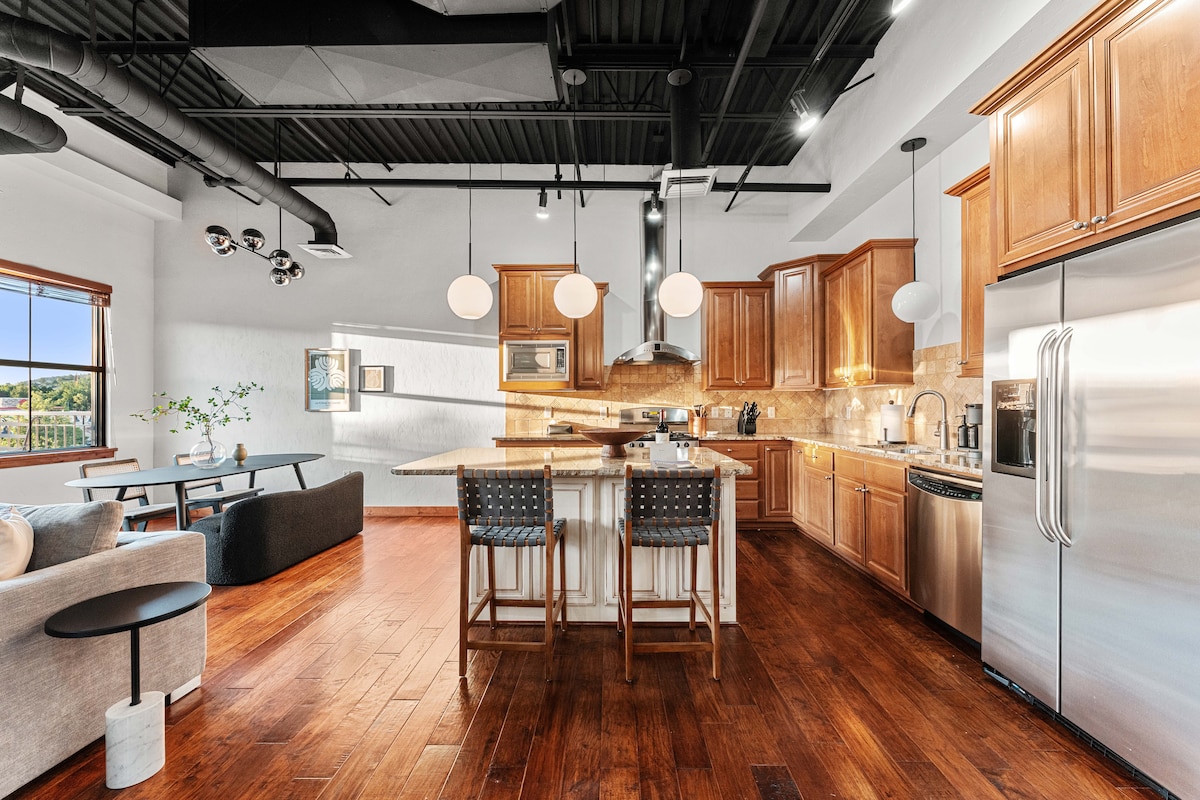 Welcome to the Executive Loft at Bown Crossing! Tasteful finishes and soaring industrialized ceilings showcase this one of a kind place. Fully furnished to satisfy the most distinguished travelers. Amazing views and quick access to Boise River, Downtown, bike trails and Boise State. Situated right above some of Boise's best restaurants in Bown Crossing. Condo sleeps four in comfort- king size bed in the master bedroom & sectional sofa makes into a queen bed.