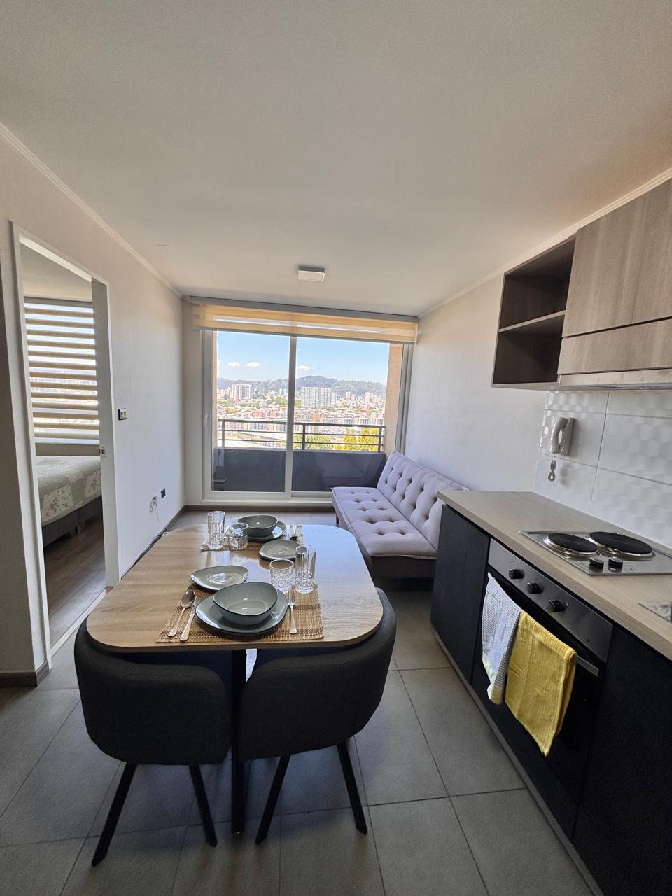 Disfruta de este departamento nuevo, full equipado para dos personas, cerradura inteligente, céntrico y muy cómodo, ideal para alojarse en Concepción. A pasos de la Universidad de Concepción, Hospital Regional, Tribunales, etc El edificio cuenta con Seguridad conserjería 24/7, Circuito Cerrado de Tv, Estacionamiento privado Subterráneo y Lavandería del edificio