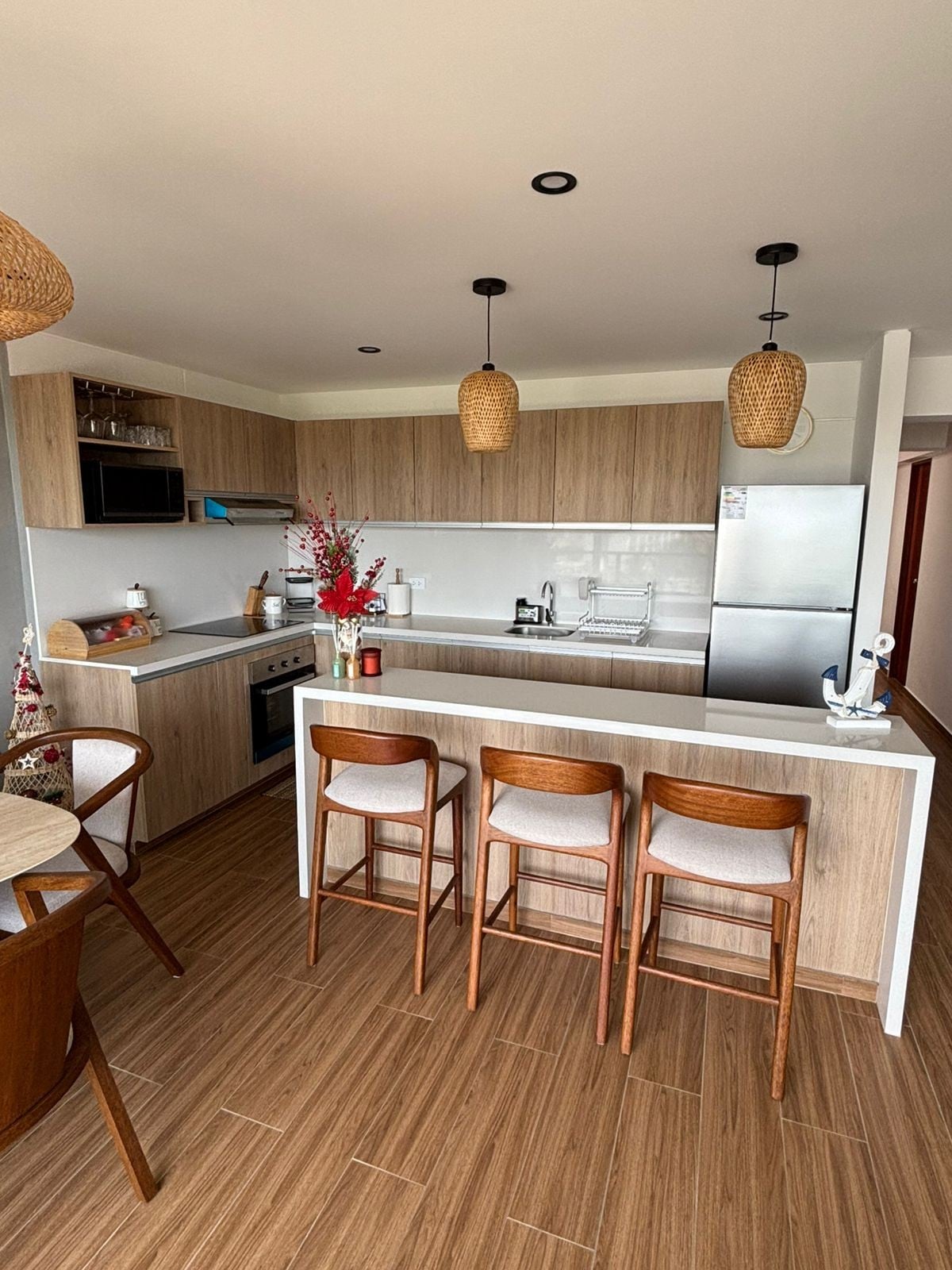 Nuestro hogar fue creado para pasar bellos momentos, no solo sentirás las mejores vibras, también tendrás todo lo que necesites para pasar días increíbles y relajantes. Puedes disfrutar en la terraza de una parrilla, frente a una hermosa vista al balneario, duermes y despiertas con el sonido mágico del mar. Estamos en el segundo piso del condominio, no contamos con ascensor, aclaramos esto para no tener inconvenientes con adultos mayores.🤗 Recuerda tratar nuestra casa como si fuera tuya.