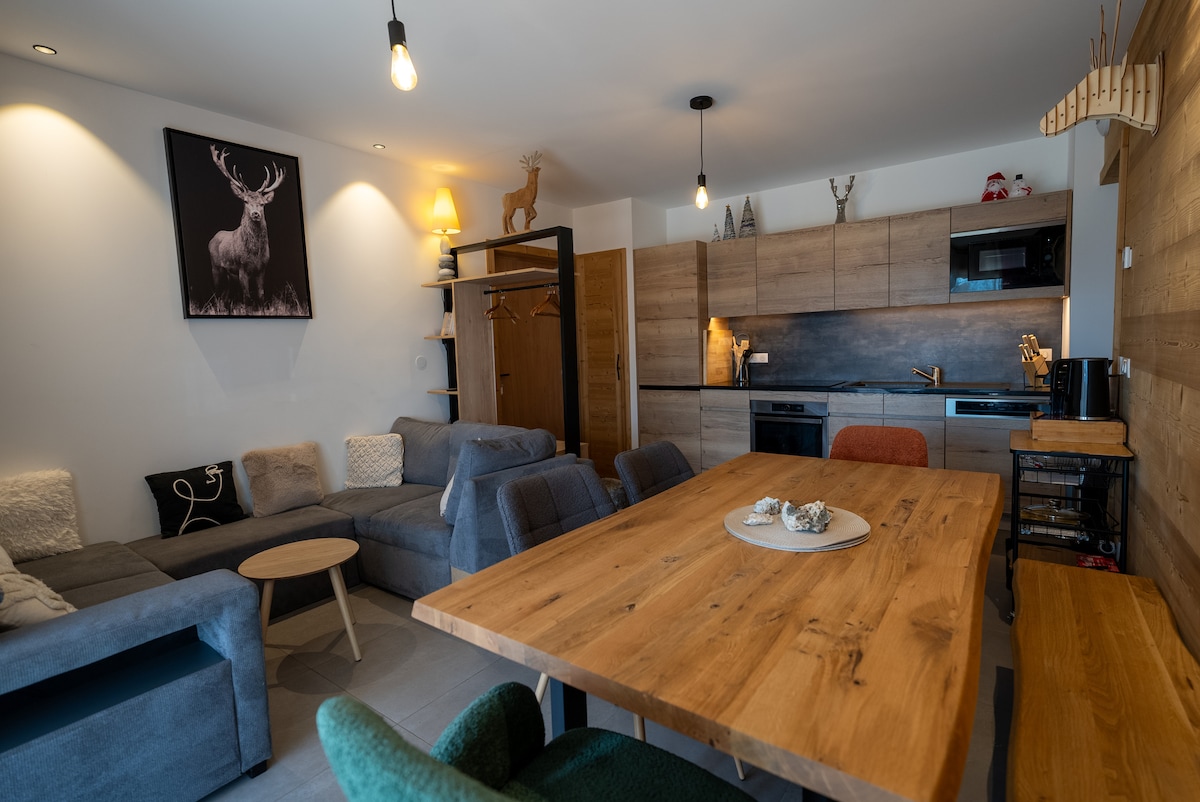 Rented in the centre of Alpe d'Huez flat of 33m² + 7 m² balcony facing south, completely renovated in the mountain style (summer 2021). It is south facing with a view of the Oisans massif. The sleeping arrangements are for 6 people (1 double bed and 2 single beds in the mountain/mezzanine area and a sofa bed of 140cm in the living area). All beds are equipped with duvets. The flat is very close to the shops and is very well equipped. Ski in/ski out.