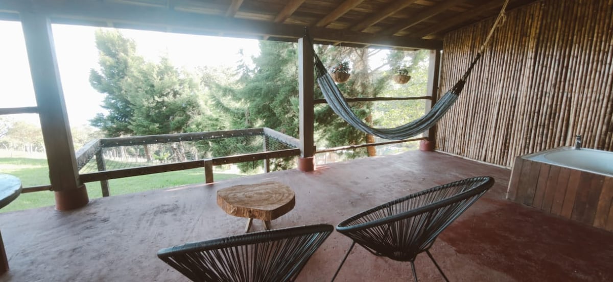 Glamping Aire Experimenta la libertad y el romance con su relajante vista a las montañas y el imponente sonido del río. Capacidad 2 personas Con cama queen, jacuzzi climatizado, malla catamarán, baño privado con agua caliente, nevera minibar, balcón y fogata exterior a leña.