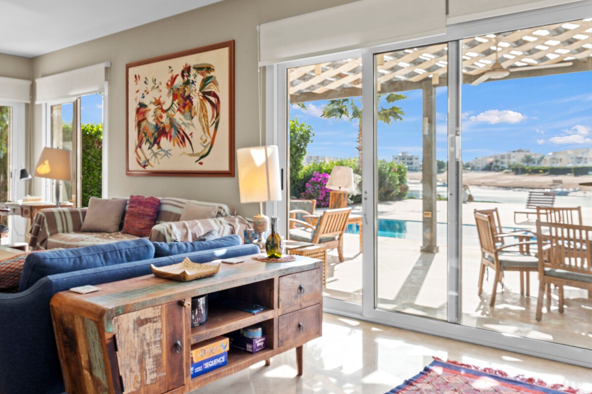 Disfruta de estar en el centro de El Gouna y alojarte directamente en una laguna de mar abierto en mi encantadora casa frente a la playa. Tanto si pasas tus mañanas en la terraza como en la playa, podrás relajarte con privacidad y tranquilidad, olvidándote de que estás a 5 minutos a pie de las tiendas y restaurantes del centro de la ciudad. Reserva esta pintoresca casa frente a la playa para disfrutar de un baño a pocos pasos de tu puerta y estar a solo 5 minutos a pie del bullicioso centro de la ciudad para cenar.