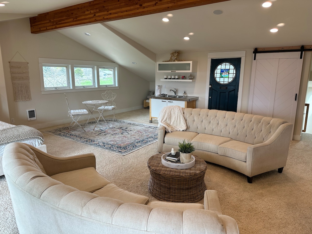 Suite de lujo con vistas a White Salmon y al río Columbia, a menos de una milla de Hood River. Rodeada de la belleza de la garganta y rutas de senderismo. Incluye: jacuzzi, chimenea, estacionamiento y entrada privados, cocina gourmet surtida, baño con ducha, cama con pedestal tamaño queen, sofá reclinable y colchón en el suelo. La suite cuenta con wifi, TV de pantalla plana, AppleTV, BluRayDVD y Apple HomePod. Los huéspedes también tienen acceso a los jardines en terraza de la casa, al estanque koi, a la zona de fogatas, a los comedores al aire libre, al jacuzzi y al gimnasio en casa.