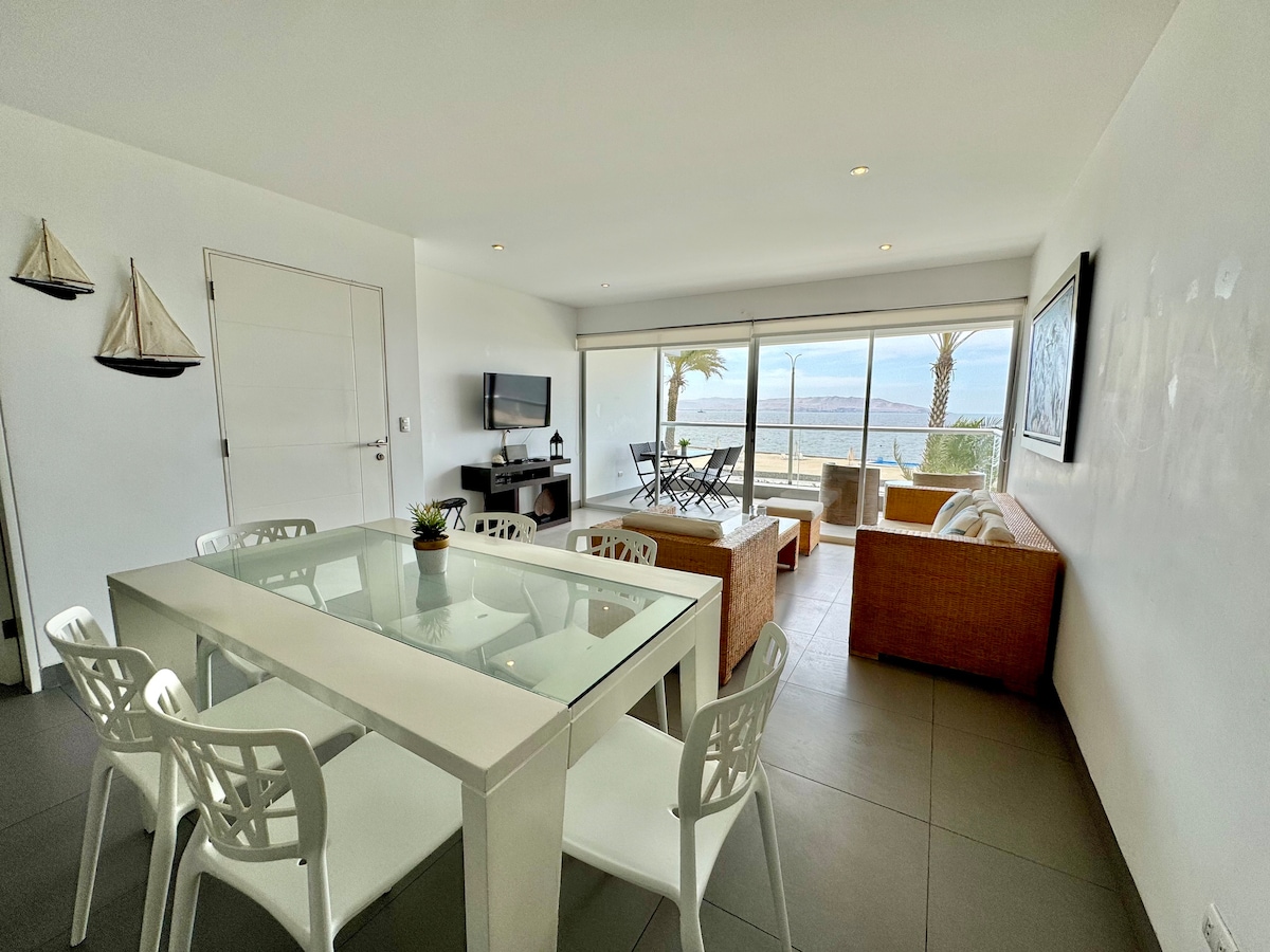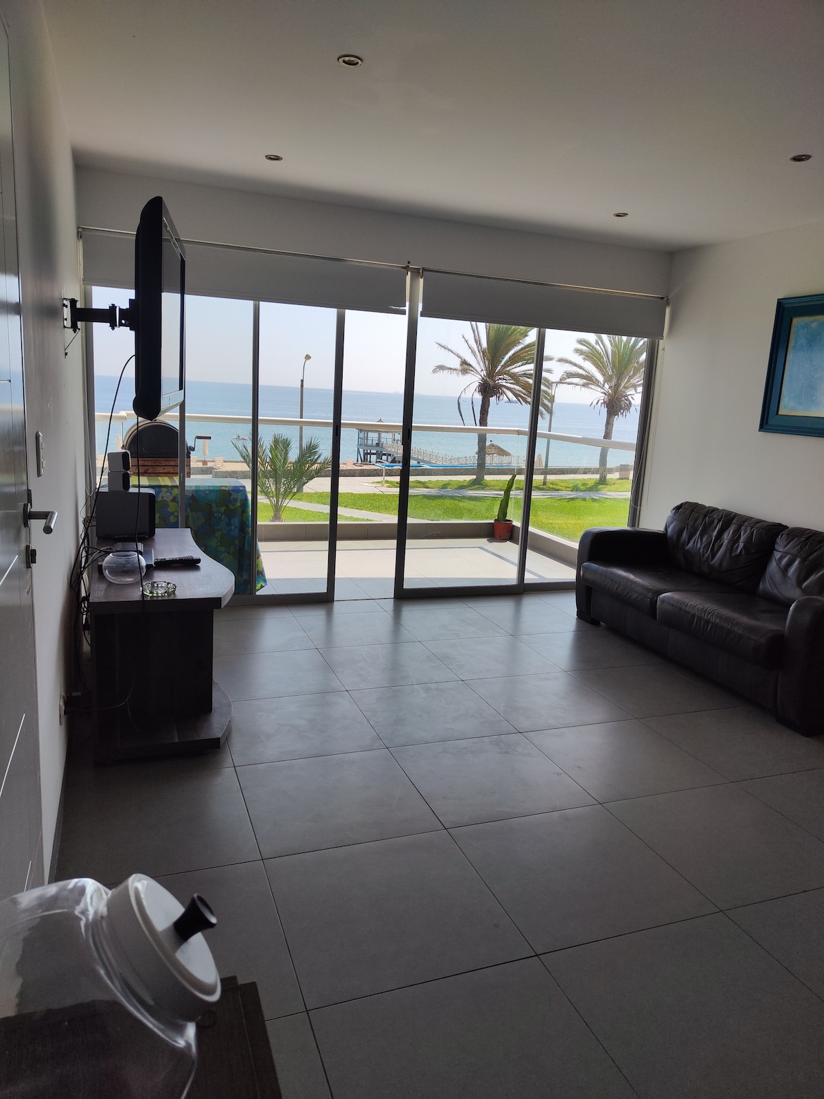 El dpto se encuentra en el 3er piso de la 1era fila del condominio Sotavento en Nuevo Paracas. Tiene un cuarto principal con baño propio con vista al mar, dos cuartos secundarios -uno con baño adentro y otro con baño afuera- con 2 camarotes cada uno y una de las camas dobles y finalmente un cuarto de servicio que tiene baño propio y espacio para dos personas más. Está totalmente equipado, con Direct TV incluido y cuenta con parrilla y horno eléctrico entre otros adicionales.