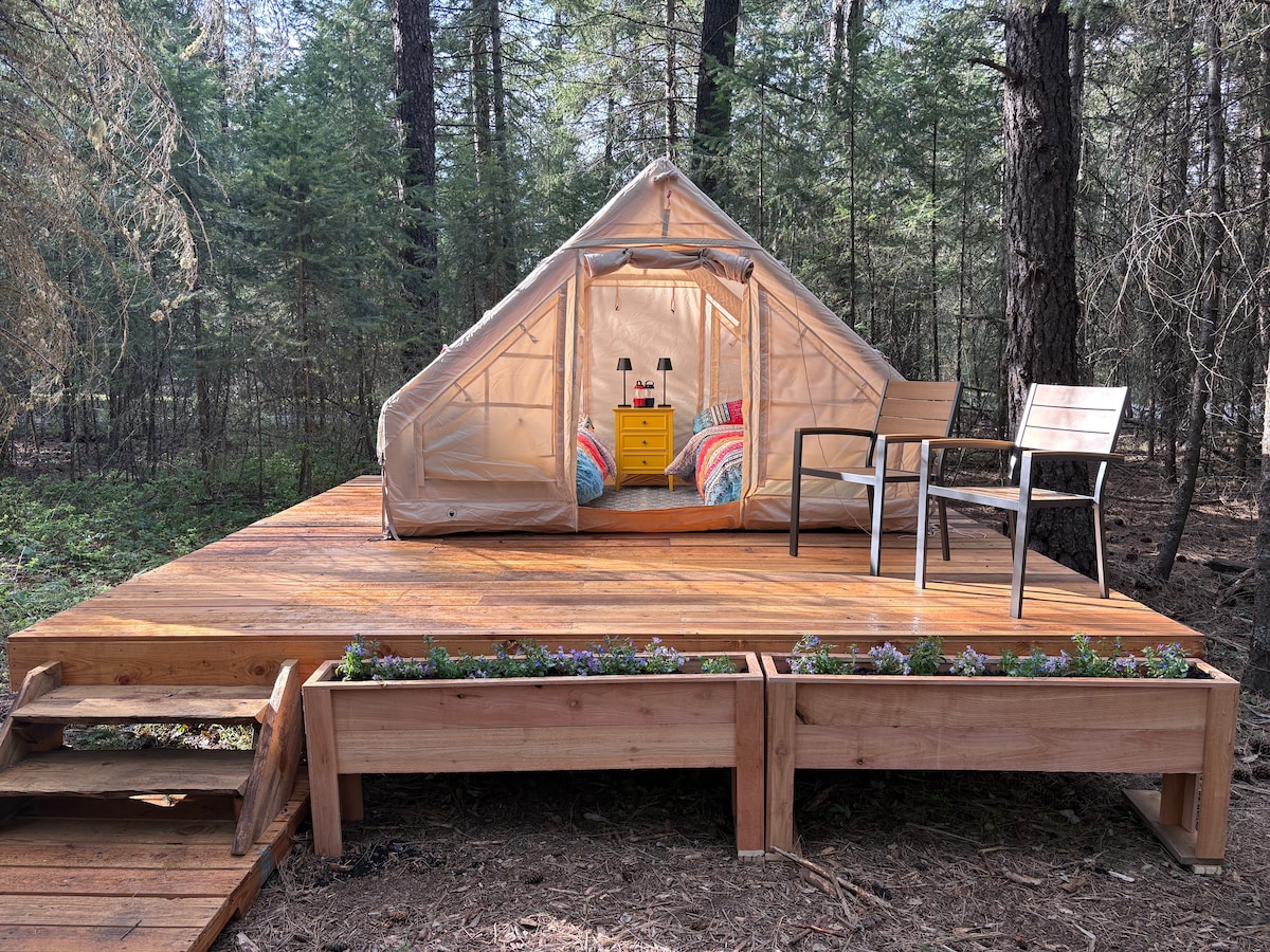 ¡Escápate a una lujosa escapada glamping en el norte de Idaho! Imagina despertarte en una espaciosa tienda de campaña de lona ubicada a lo largo del pintoresco río Pack. La exuberante vegetación y el suave murmullo del río crean un refugio privado para dos. Relájate en tu lujosa cama tamaño king o relájate en la terraza privada, ambas con impresionantes vistas al río. Contempla las estrellas por la noche y vuelve a conectar con la naturaleza con total comodidad. ¡Esta escapada romántica te espera! Enamórate de este alojamiento tan romántico situado en plena naturaleza.