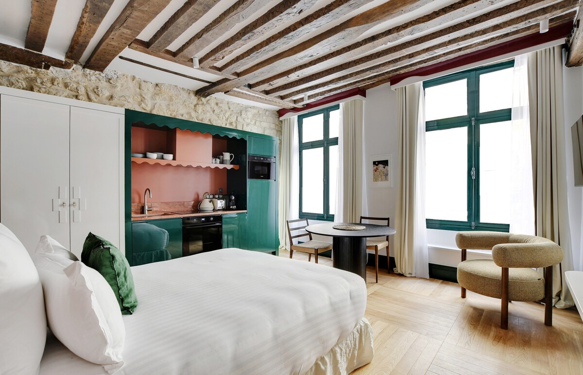 Perfectly located in the heart of the Marais, this newly refurbished, elegant one-bedroom apartment is set in an authentic Parisian building dating back to the early 1700s. It features a bedroom with a queen-size bed and a peaceful view over a private church garden, a living area with a convertible sofa, TV, and kitchenette, and a stylish bathroom with an Italian shower. The metro is less than a 3-minute walk (Line 1), with restaurants, museums, parks, and the Seine just steps away.