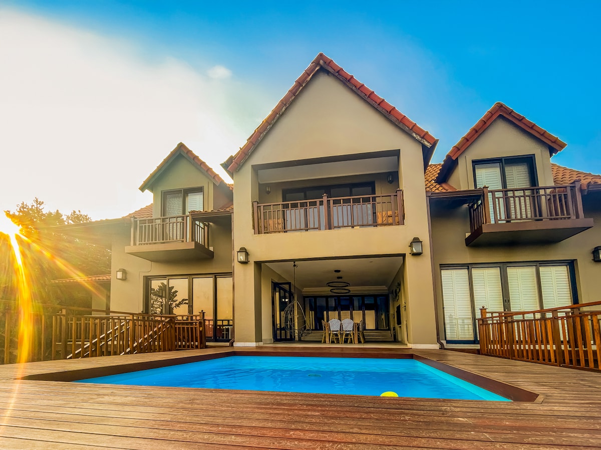 A serene coastal sanctuary with panoramic ocean views, a private pool, fire pits and beautiful open plan indoor–outdoor spaces. Sleeps 10 (max 8 adults) Located in the secure Simbithi Eco Estate and only 1 kilometre from the Blue-Flag Thompson's Beach, the villa offers 4 ensuite bedrooms, a fully equipped kitchen and solar and water backup. Ideal for families, wellness retreats and groups seeking luxury space, calm and comfort by the sea.