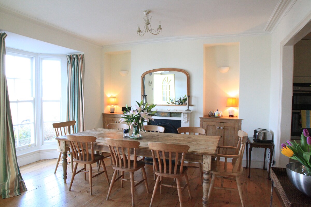 Fabulosa casa georgiana de cinco dormitorios con bonitas vistas al mar desde la mayoría de las habitaciones. Está en una carretera tranquila en la costa norte de Devon, idealmente situada para aquellos que disfrutan del aire libre, con paseos costeros en la puerta y maravillosas playas a poca distancia (Woolacombe es la playa de surf más cercana). Perfecta para aquellos que disfrutan de la comodidad, muchos baños (enorme cilindro de agua caliente), camas y ropa de cama muy cómodas. Mesa de comedor grande, perfecta para comidas familiares o grupos grandes de amigos.