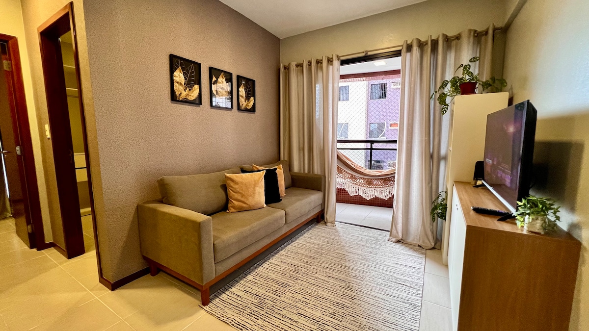Alójate a solo unos pasos de la basílica. Perfecto para quienes vienen a vivir el Círio o quieren sentir de cerca el ambiente de la capital de la COP30. El apartamento de 50 m² fue diseñado para combinar comodidad y practicidad: Acogedor dormitorio con una cama doble, dividida y suite con ducha eléctrica. Sala de estar con sofá cama, TV e internet para trabajo o placer. Cocina con nevera, fogones, microondas, cafetera, sandwichera y todos los utensilios. Cochera Zona de ocio con piscina, gimnasio y zona de barbacoa