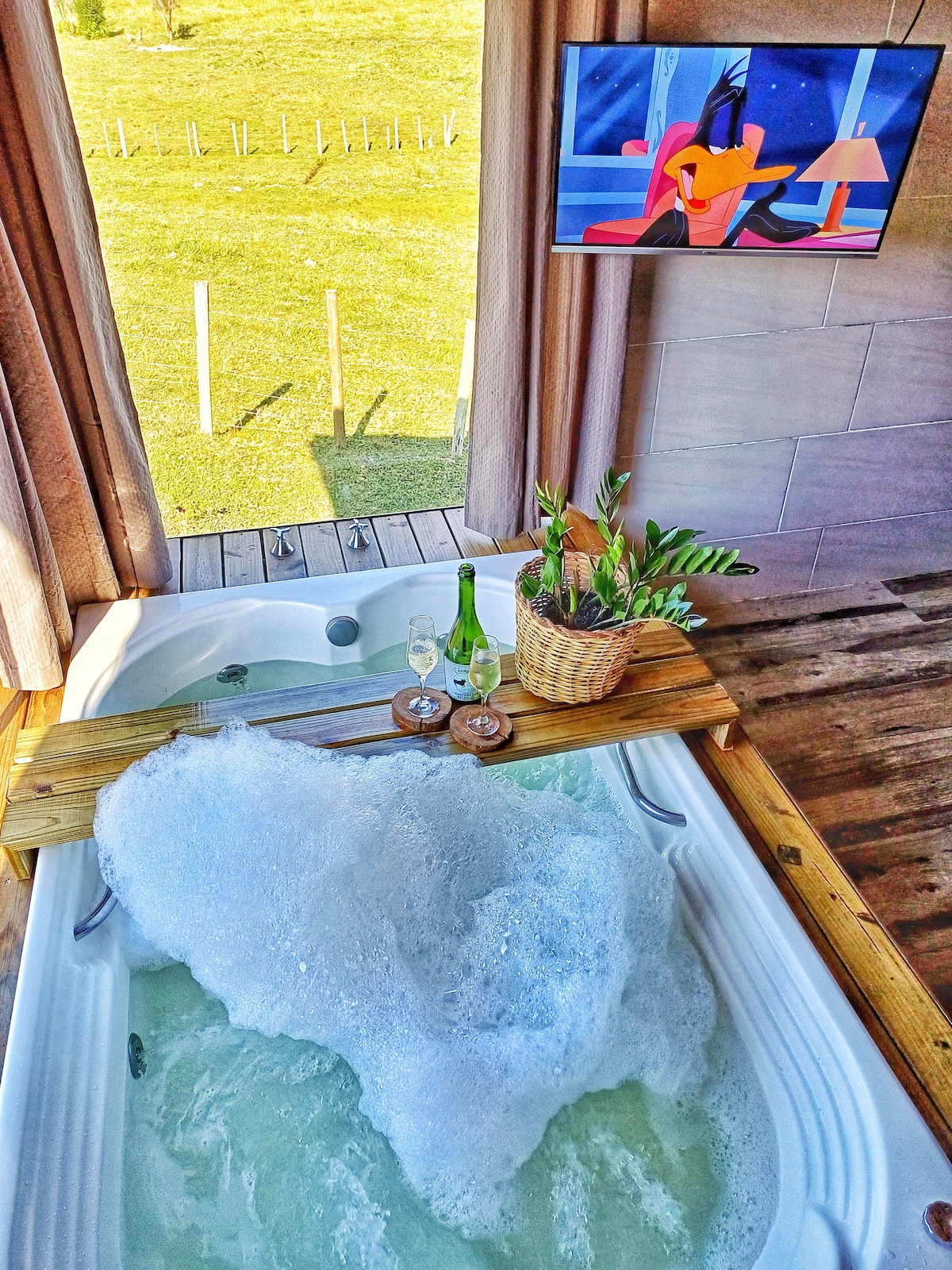 Descubre la calidez de nuestro chalet, ideal para momentos de paz y privacidad. Con una decoración rústica y elegante, el espacio cuenta con una cama tamaño king, un baño privado y detalles diseñados para tu comodidad. Relájate en la bañera de hidromasaje y disfruta de la tranquilidad de un ambiente que combina encanto y naturaleza. Perfecto para recargar energía en medio de la serenidad del lugar.