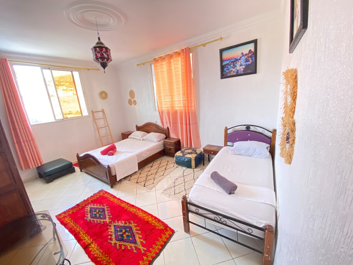 ¡Te damos la bienvenida a Clapo Surf House! Escápate a nuestro lugar feliz en el corazón de Imsouane. Nuestra casa de huéspedes ofrece comodidad, ambiente familiar y pasión por el surf. Tu habitación privada con dos camas individuales te espera con ropa de cama cómoda y desayuno. Disfruta del sol en nuestra terraza en la azotea, el lugar perfecto para relajarte después de un día montando las olas y admirar la puesta de sol. ¡Empápate de la vibrante cultura del surf de Imsouane! Experimenta la emoción del surf, su famosa bahía infinita y las legendarias olas adecuadas para todos los niveles.