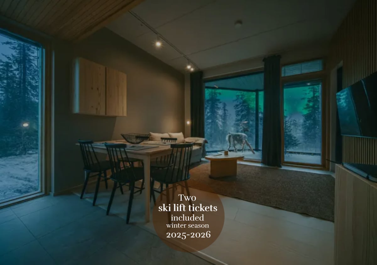 VILLA PEPPI. ¿Sueñas con unas vacaciones en la estación de esquí más popular y hermosa de Finlandia? Relájate en esta evocadora y elegante casa adosada en Levi. Rodeada de bosque, una casa de campo de dos apartamentos se encuentra cerca de las laderas noreste, a solo 4 kilómetros del centro de Levi. En esta casa de campo, puedes disfrutar de la encantadora tranquilidad de Laponia, pero si estás buscando algo para ir, puedes encontrarlo cerca. El autobús de esquí pasa a 300 m (parada n.º 12). Pendiente más cercana 1,2 km (Golf-rinne)