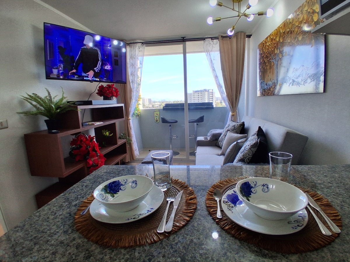 Edificio nuevo, Cercano a metro hospitales, supermercado, con piscina disponible. 1 habitación con cama matrimonial, walking closet y baño. Living comedor con cocina integrada. Sillón cama para 2 personas. Depto en piso 7. A 15 minutos en auto de mall Costanera Center y Parque Arauco, y de Outlets de Quilicura. A 15 min del centro de Stgo, en auto. Incluye estacionamiento en el subterráneo del edificio. Se incluye toallas de baño, secador, sábanas de cama. Ventilador en verano/primavera.