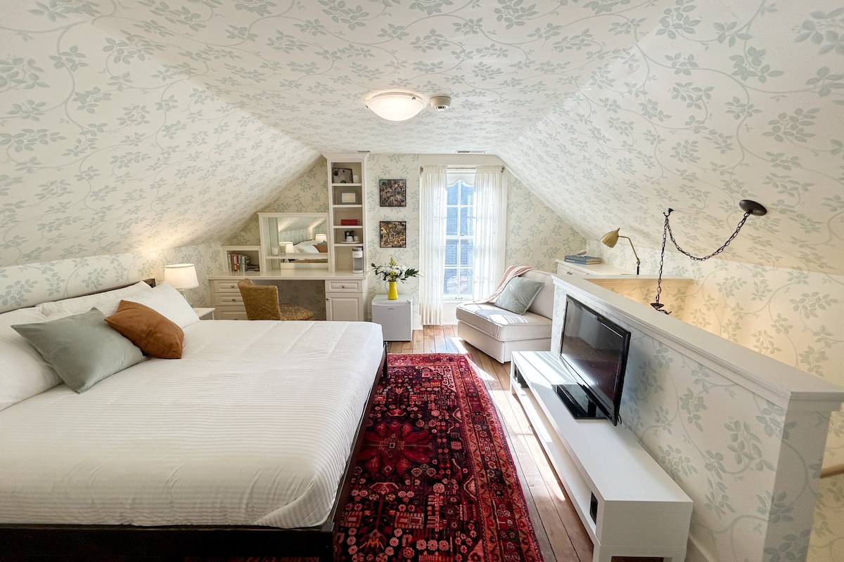 Esperamos recibirte en una suite privada que es el alojamiento de huéspedes de nuestra casa. Tendrás una entrada privada y 3 habitaciones para ti. Hay una sala de estar con una mesa y sillas, un dormitorio con una cama tamaño queen (mesitas de noche, vestidor y armario con perchas para tu uso) y un baño completo recién remodelado. También hay una pequeña cocina en el pasillo, que es un gabinete antiguo Hoosier equipado con microondas, mininevera, cafetera y olla de agua caliente.