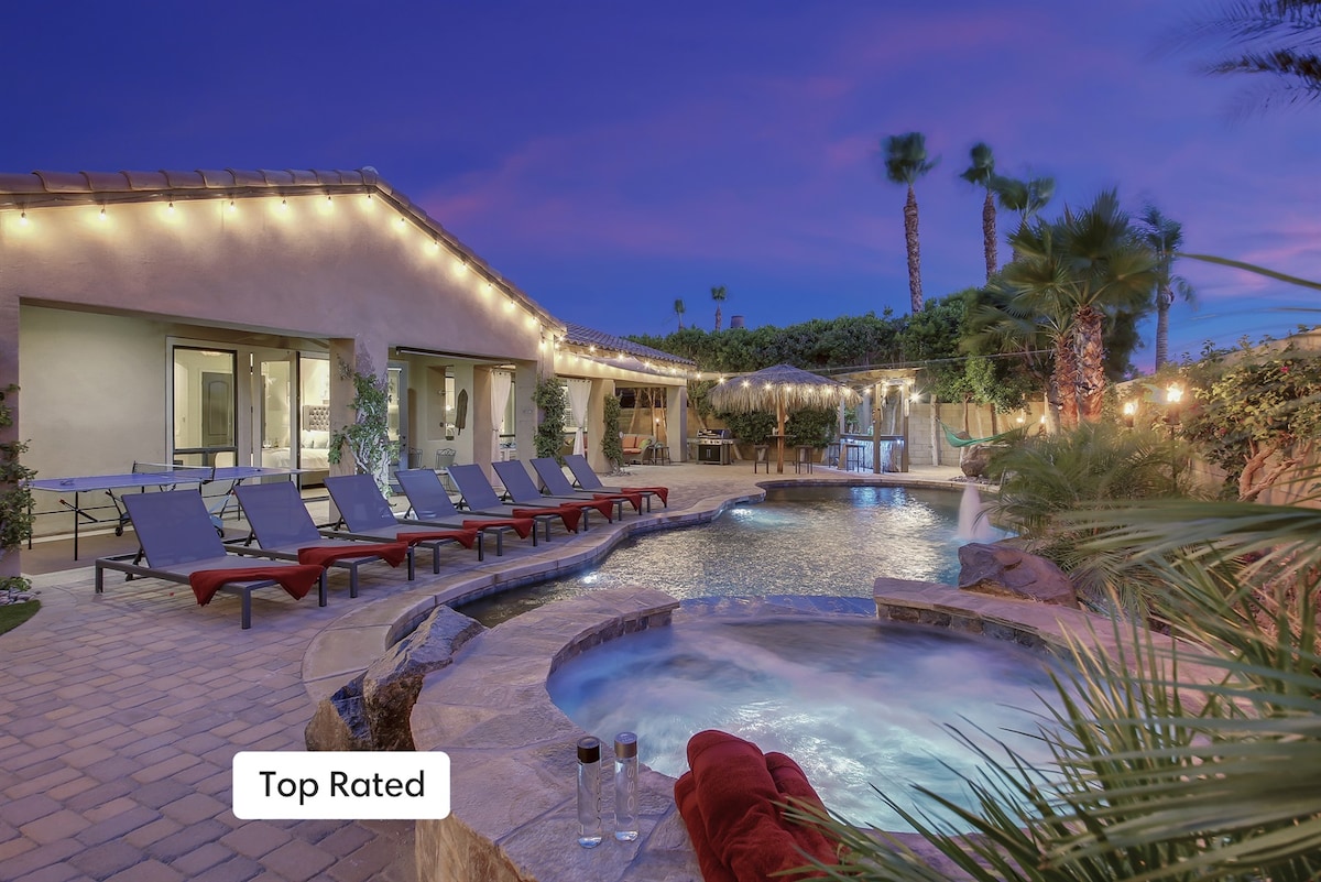CASA DE LUJO MONTAGE El patio trasero estilo resort cuenta con una gran piscina de agua salada con spa para 12 personas. Voleibol, chorros de cubierta, gran aliviadero, burbujeadores, luces LED, borde de bronceado, putting green, parrilla Weber, rociadores de patio, TV exterior, ping pong, futbolín, chimenea, múltiples áreas de conversación y comedor, interior de lujo con islas dobles y Kuerig, televisores inteligentes, dormitorios y ropa de cama de lujo, bar húmedo, chimenea. ¡Perfecto para tu escapada al desierto!