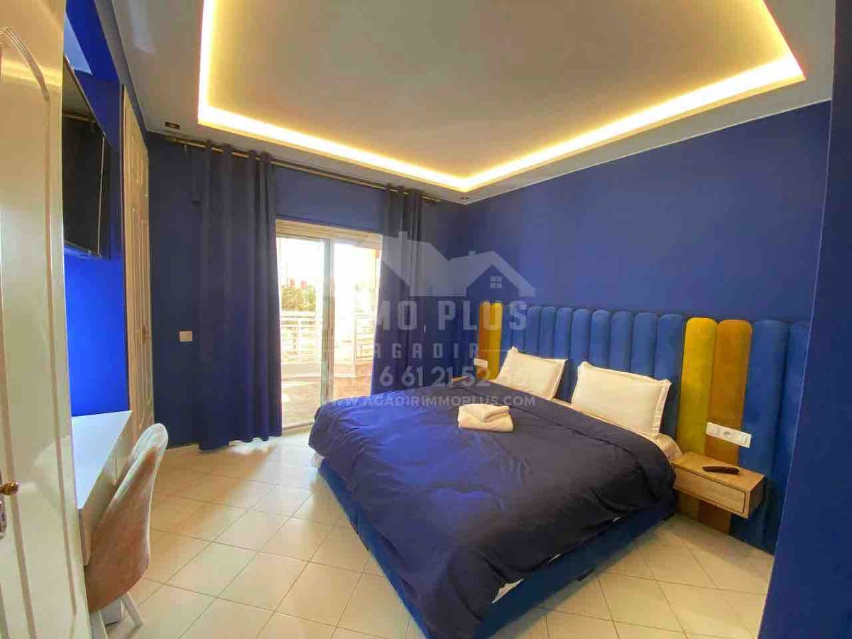 Location bel appartement meublé pour vacances à Agadir Bay zone touristique sécurisée, composé de 2 chambres et salon spacieux, cuisine équipée, dans le salon grand télé et wifi, Netflix, IpTv. Climatisation centralisée disponible, une salle de bain et une toilette, sèche-cheveux, serviettes et fer à repasser sont disponibles, balcon vue extérieure, appartement sis au 3ème étage avec ascenseur, piscine pour enfants, parking gratuit sécurisé devant l'immeuble. NB : les invités sont interdit !