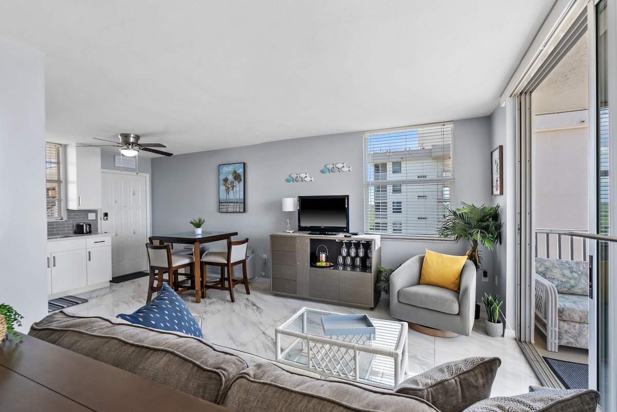 ¡Te damos LA bienvenida A ELEVARTE bajo EL SOL! Donde una experiencia elevada está esperando. Anfitrión Premier (otro sitio)-4.8* La unidad cuenta con una cocina completamente remodelada con encimeras de cuarzo, electrodomésticos nuevos que incluyen un lavavajillas (muy raro), nuevos muebles de sala de estar y aire acondicionado nuevo y transmisión de sonido envolvente de música a través de Amazon Alexa y Apple Music. Los amaneceres se incluyen todas las mañanas en tu balcón privado y las puestas de sol son impresionantes en la playa con dedos de los pies en la arena blanca brillante.