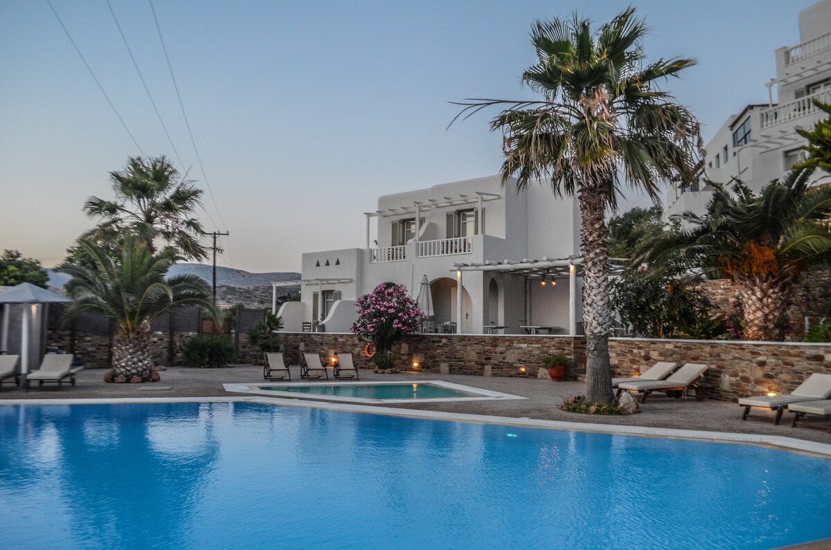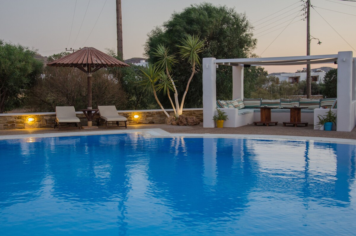 Olga's ofrece elegancia de estilo cicládico, comodidad moderna (aire acondicionado, TV, wifi) en un ambiente relajado y agradable: hermosa piscina y bar, todas las habitaciones con duchas privadas, balcones privados con vistas a la piscina, desayuno de origen local, excelente servicio, ¡excelente ubicación!