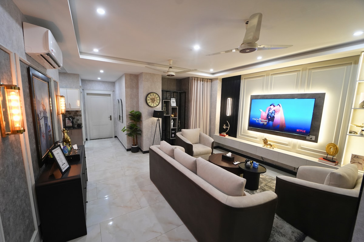 Disfruta de la serenidad en un apartamento de esquina de 2 dormitorios con temática Japandi, único en su clase, situado idealmente en el corazón del centro de Islamabad. El espacioso apartamento (1710 pies cuadrados) cuenta con un minimalismo moderno, dos balcones privados que ofrecen vistas panorámicas de las colinas de Margalla y Gulberg Greens, cómodas camas, espacio de trabajo dedicado, wifi de 40 mbps, un cine en casa para noches de cine acogedoras, juegos de mesa y una cocina abierta totalmente equipada para cocinar tu comida favorita. ¡Perfecto para familias, amigos o trabajadores remotos!