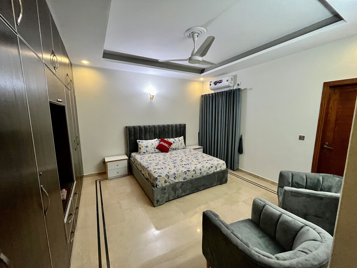 Feel free to book or message me first. Happy to answer any specific questions in advance at +92 344 481 triple 5 8. Welcome to our charming urban retreat. Enjoy the convenience of walking distance to Safa Gold mall, Mr Chips restaurant , and a nearby masjid. Easily accessible Uber and Food Panda services enhance your stay. Our well-equipped property features high-speed internet, air conditioning,KING bed along with single bed, 24/7 security, and parking.