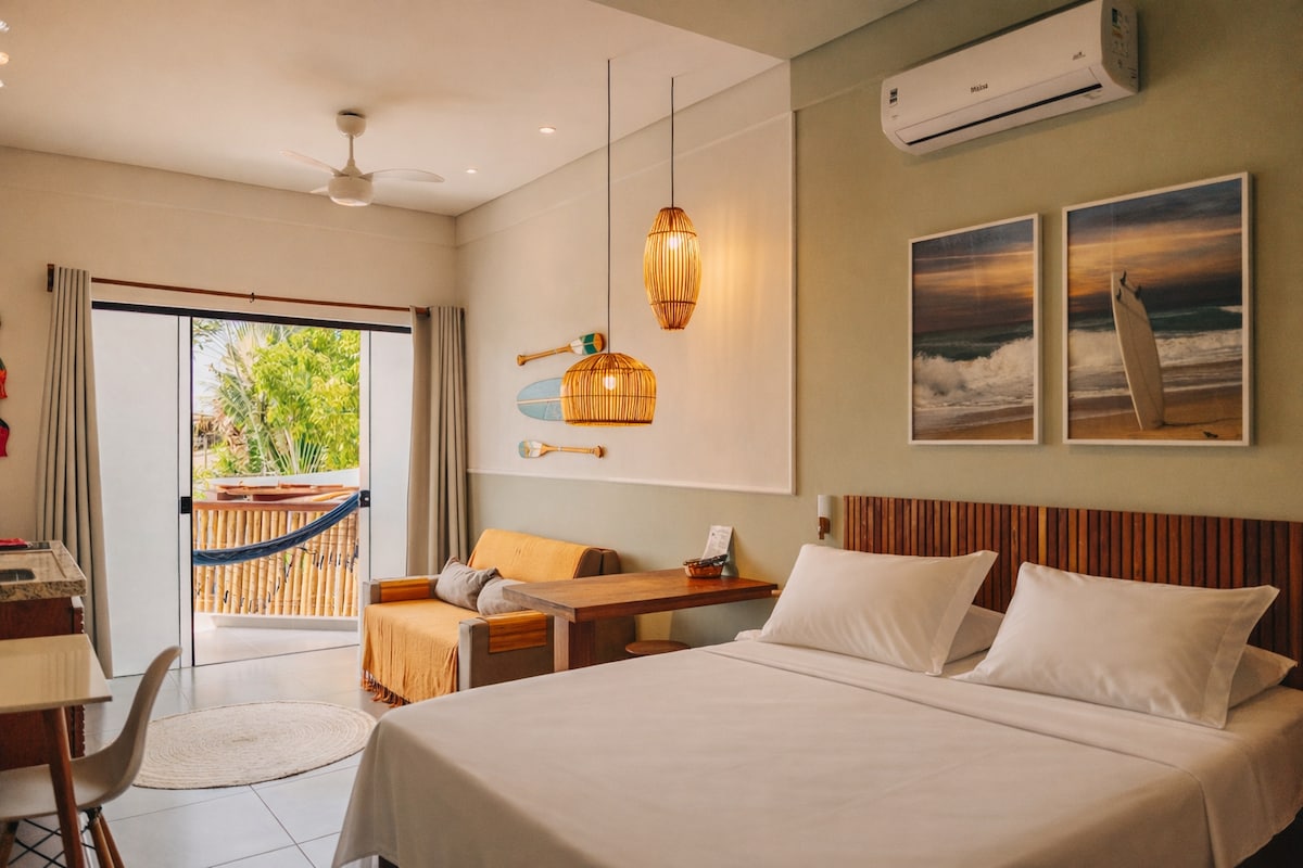 El pueblo se siente abrazado por la naturaleza en nuestro refugio en Alto da Mata. El balcón, con su parrilla y mesa al aire libre, es tu cabaña exclusiva para el espectáculo diario de la puesta de sol sobre el dosel de los árboles. El concepto abierto crea un entorno único e integrado, perfecto para crear recuerdos en un entorno impresionante, a pocos minutos del centro de Itacaré.