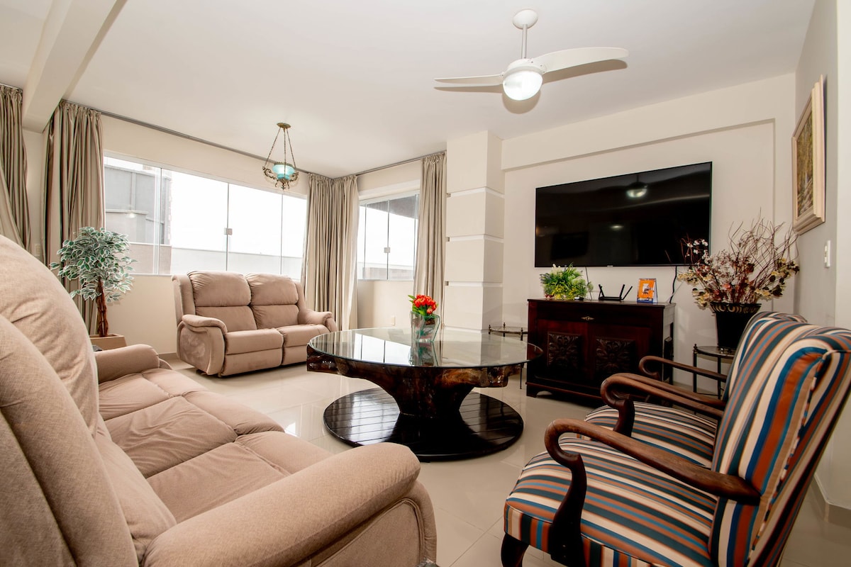 Perfeito para famílias que buscam conforto e sofisticação, com a beleza do mar à sua frente! Localizado na região central, à 30 metros da praia. * Churrasqueira à carvão com espetos giratórios, para churrascos inesquecíveis. * Adega climatizada e cervejeira. * Ares-condicionados em todos os ambientes. * 4 suítes com smart tvs. * Enxoval premium (cama, banho e mesa). * Wi-Fi exclusivo. * Elevador social privativo. * Garagem para 2 carros. * Serviço de organização diária contratado à parte.