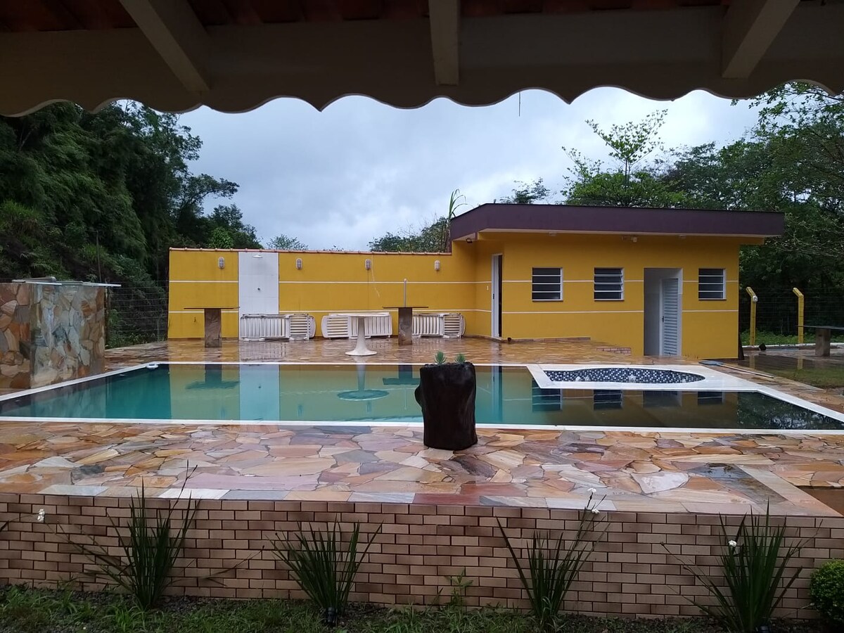 ¡Ven a pasar tus vacaciones aquí en este maravilloso lugar! A 7 km de la playa, visita la plataforma de pesca de Mongaguá. Casa con 4 suites, cervecería, piscina, wifi, parque infantil, mesa de billar, mesa de futbolín, barbacoa, garaje privado. Sítio cerca de Cachaçaria Fazenda, Pesqueiro Tô na Boa e Cachoeira. ¡Un paraíso! Alquilamos con la fábrica de cerveza vacía (bebidas en nombre de los huéspedes). Tiene una cámara de vigilancia fuera de la casa.