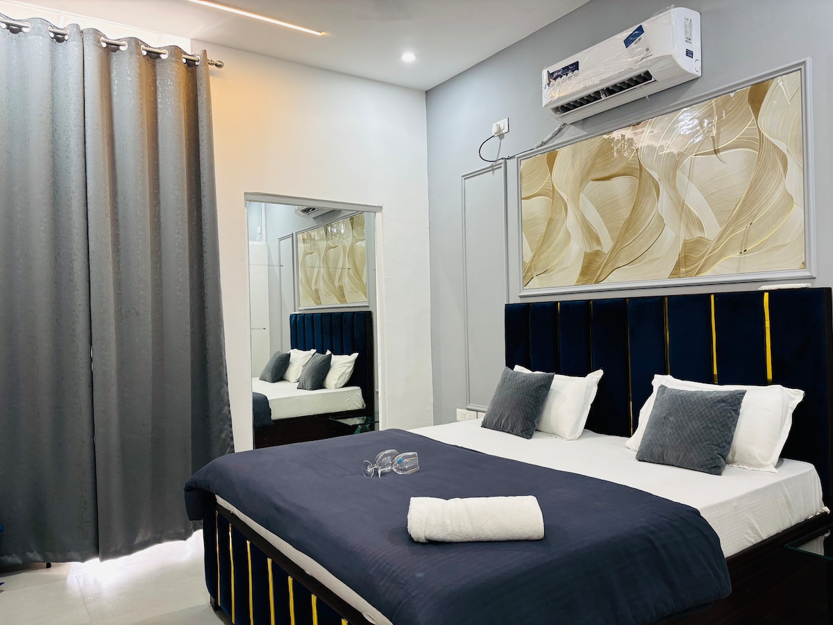 Nuestro apartamento de 2 dormitorios de nueva construcción combina la comodidad moderna con el encanto natural. El espacio cuenta con 2 dormitorios serenos con camas tamaño queen, una amplia sala de estar, una cocina bien equipada, 2 baños: uno adjunto al dormitorio principal y otro accesible desde la sala de estar y el segundo dormitorio y un balcón en forma de L que ofrece excelentes vistas de la ciudad. ¡La propiedad se encuentra cerca de un centro comercial prémium en Noida! Esta ubicación bien situada te ofrece la comodidad de tiendas, cafeterías y entretenimiento.