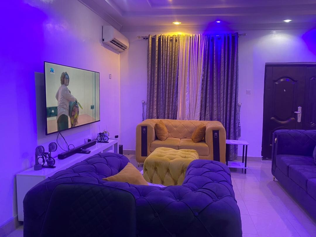 Es un apartamento de 2 dormitorios en el segundo piso de Sunnyville Apartment Estate. Tú y tus seres queridos estarán cerca de todo lo necesario cuando te hospedes en este lugar céntrico. El apartamento está cerca del aeropuerto, una farmacia enfrente, hospital, supermercado, restaurante y mercado de alimentos cerca para todo lo que puedas comer. 24 horas de electricidad generada por inversor y paneles solares y un generador de respaldo además. Transporte accesible, se puede organizar un conductor de recogida a petición.