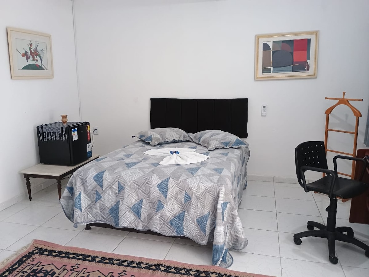 Espacio bien equipado con suite. Tiene aire acondicionado, una televisión inteligente, un minibar, una cama doble y un escritorio. Cocina exterior compartida, equipada con estufa, refrigerador, mesa, cafetera, sandwichera, entre otros. Hay barbacoa con zona abierta para el ocio. La cocina está bien equipada con lo necesario para preparar tus comidas. El entorno es tranquilo, familiar y muy bien ubicado. Cerca del aeropuerto de Guararapes, centro de la ciudad, ciudad universitaria, Boa Viagem, Olinda...