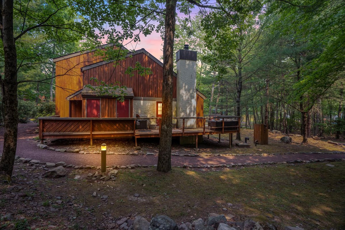 One of few homes that boasts a huge Wall of Windows that open to views of Camelback Mountain and the nature outside. The house is set back just a bit for that extra privacy. This Mountain Home features 3 master suites with full bathroom with each bedroom. Cozy enough for couples yet spacious enough for families and friends. Winter mountain views from every room in the house. Nicely stocked kitchen and gas BBQ grill on the deck. Minutes away from everything you’d come to the Poconos for.