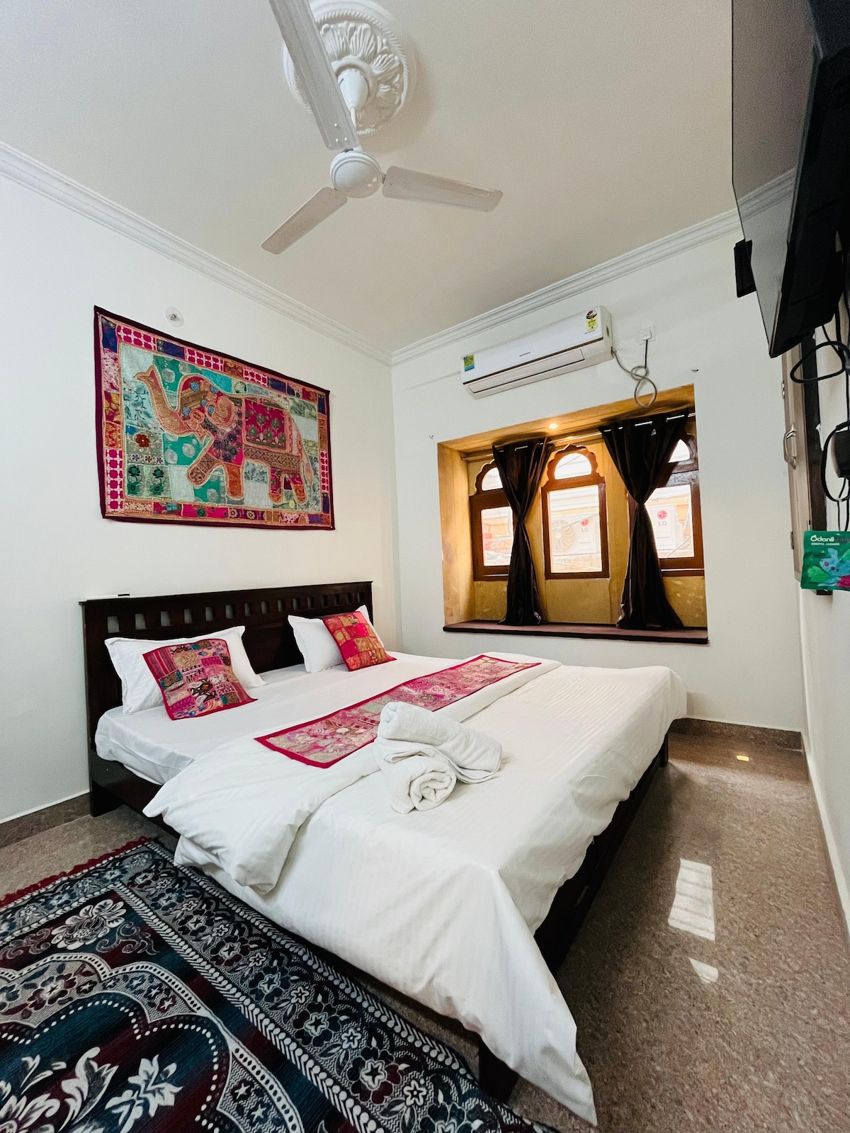 Alójate en nuestra amplia y bellamente decorada habitación, perfecta para 2 o 3 personas. Disfruta de una decoración elegante con cortinas estampadas en bloques, telas hechas a mano y un ambiente blanco cálido que crea un ambiente tradicional de Rajastán. Las características incluyen una acogedora cama suave, un baño grande y una tradicional jharokha de piedra. Los espacios comunes son un plus. Nos enorgullecemos de la limpieza, la cálida hospitalidad y la deliciosa comida. Ubicado en el corazón de Jaisalmer. También organizamos visitas turísticas locales, safaris por el desierto y estancias mágicas en las dunas