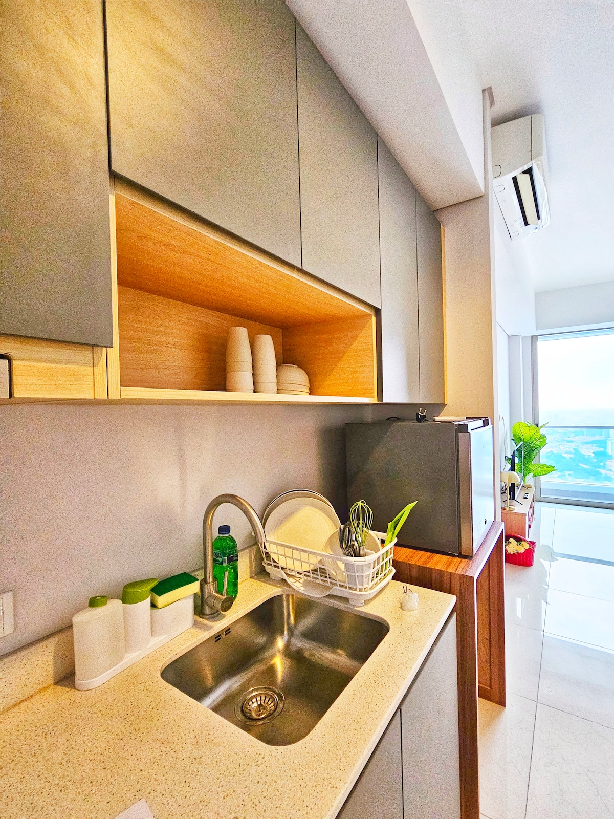 Apartamento estudio de estilo moderno a estrenar con televisor inteligente Samsung Crystal 4K UHD de 50". Ubicado en Tower Fragrant, conectado con Hublife y el centro comercial Taman Anggrek. - Netflix gratuito - Wifi gratuito. - Agua mineral de barril -Dispensador - Estufa eléctrica - Refrigerador. -Microondas - Secador de pelo. - Lavado de cuerpo - Mesa de trabajo. Lugares emblemáticos cercanos: a 5 minutos del centro comercial Central Park, el centro comercial Neo Soho y a 10 minutos del centro comercial Ciputra. A 20 minutos del aeropuerto.