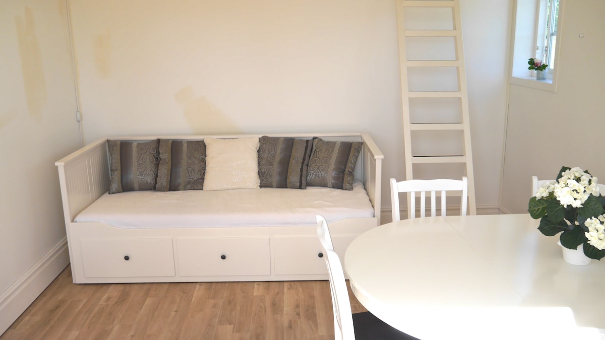 Cabaña de madera recientemente renovada del siglo XVIII para 1-2 personas. Disfruta de una estancia cómoda y acogedora con chimenea, TV, microondas, horno, cocina, cafetera y hervidor de agua, nevera y congelador, cocina integrada y retrete de combustión. La cabaña ha sido cuidadosamente renovada siguiendo el estilo tradicional de Hälsingestad y con pinturas ecológicas de aceite de linaza. En la casa contigua, a unas decenas de metros de esta propiedad única y tranquila, hay una ducha, un aseo adicional, un lavavajillas y un armario.