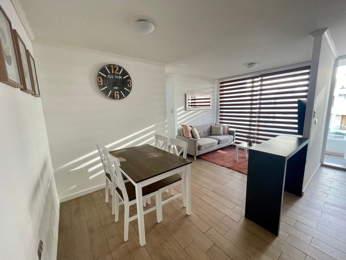 Lindo Departamento a metros de supermercados, centros comerciales y playa. Además cerca del terminal de buses y locomoción tanto dentro de la ciudad como hacía el valle o balnearios! Cómodo y acogedor. Cocina equipada y estacionamiento para vehículo! Pet friendly!