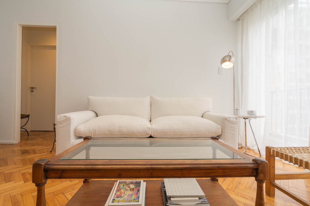 Es un departamento elegante, amplio (60 m2) y luminoso en un antiguo edificio de Recoleta, con una excelente ubicación para vivir una experiencia porteña con espacios verdes, rodeado de museos y restaurantes. Está muy bien decorado, lo que lo ha llevado a ser publicado en revistas de decoración relevantes. Tiene un pequeño balcón que mira a una plaza pequeña (Plaza del Lector II). La Biblioteca Nacional esta a media cuadra en diagonal.
