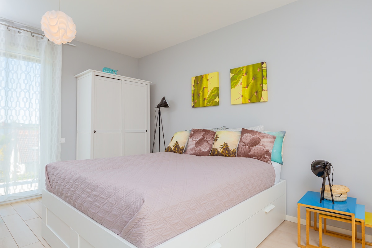 Apartament z balkonem i prywatną sauną na zamkniętym nowym osiedlu niedaleko piaszczystej plaży i centrum. Nowoczesny i przytulny design. Apartament posiada pralkę, zmywarkę, ekspres ciśnieniowy z młynkiem, żelazko. W salonie i sypialni znajdują się pojemne szafy. Do dyspozycji gości są: wygodne duże łóżko oraz komfortowa rozkładana sofa. W budynku jest winda. Dodatkowe prywatne miejsce postojowe znajduje się obok nieruchomości. Aranżacja apartamentu sprawi, że wypoczynek będzie niezwykle udany!