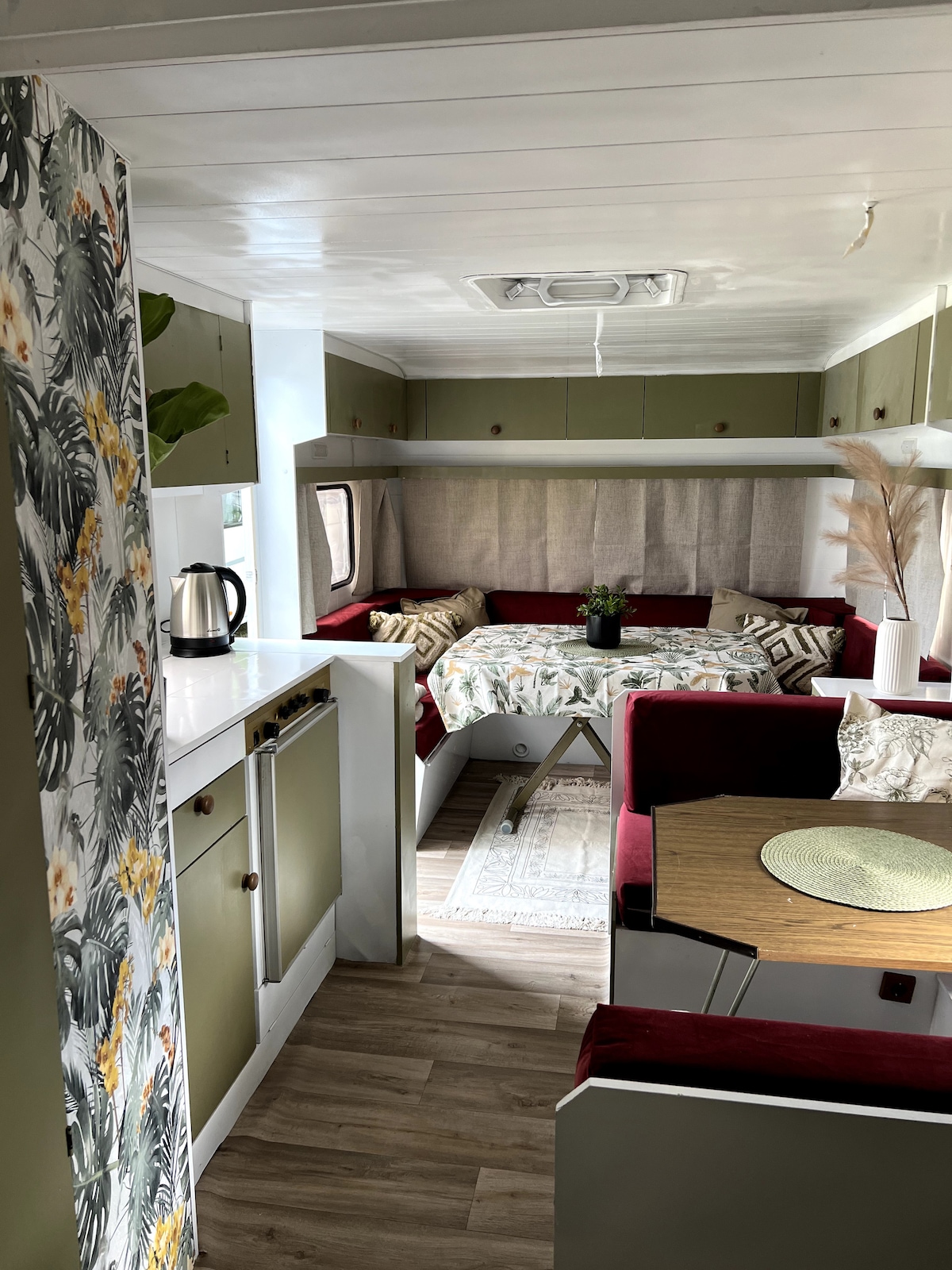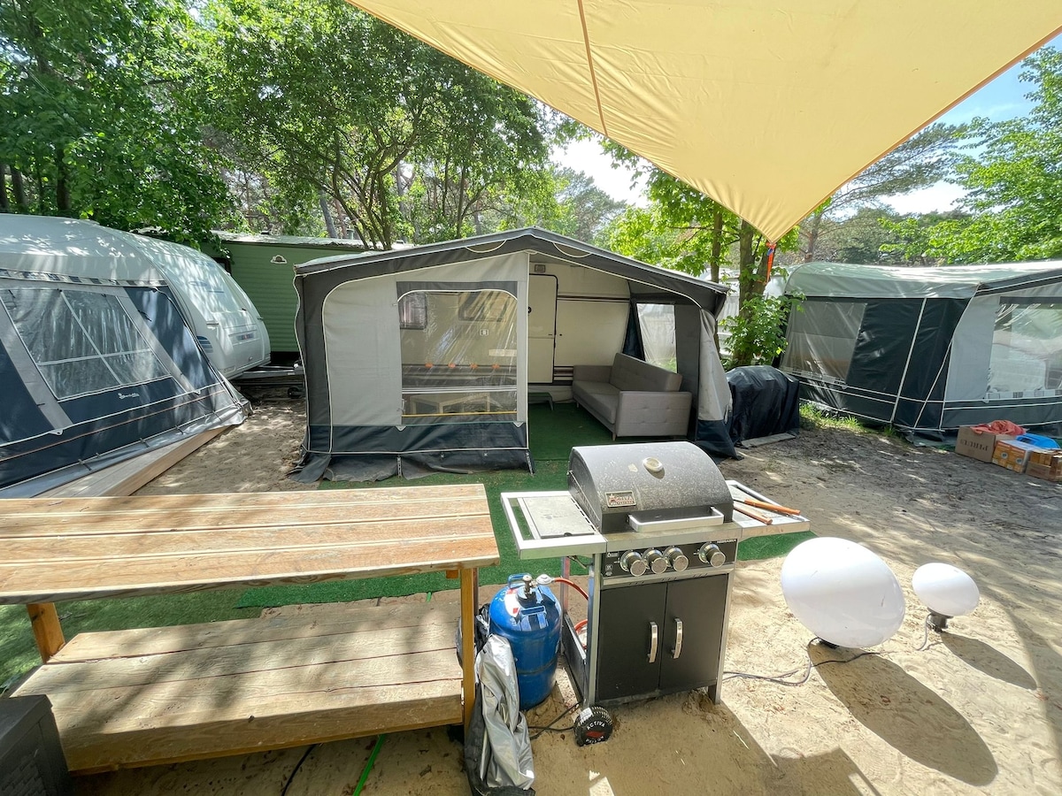 Ofrecemos nuestra base de temporada para viajes al mar en Ekolaguna Camping en casas rurales. Este es un remolque Dethleffs bien mantenido con un vestíbulo en un rellano de madera, en la segunda fila desde la bahía, junto a un súper claro, y una pequeña playa de arena agradable con un lugar para despegar/aterrizar las cabañas. Todo está bien equipado y estéticamente agradable +WiFi. Limpio, agradable y en un gran vecindario ;-) Las cómodas duchas, el baño y el inodoro están en la zona central del camping. Los huéspedes están sujetos a cargos adicionales de acampada